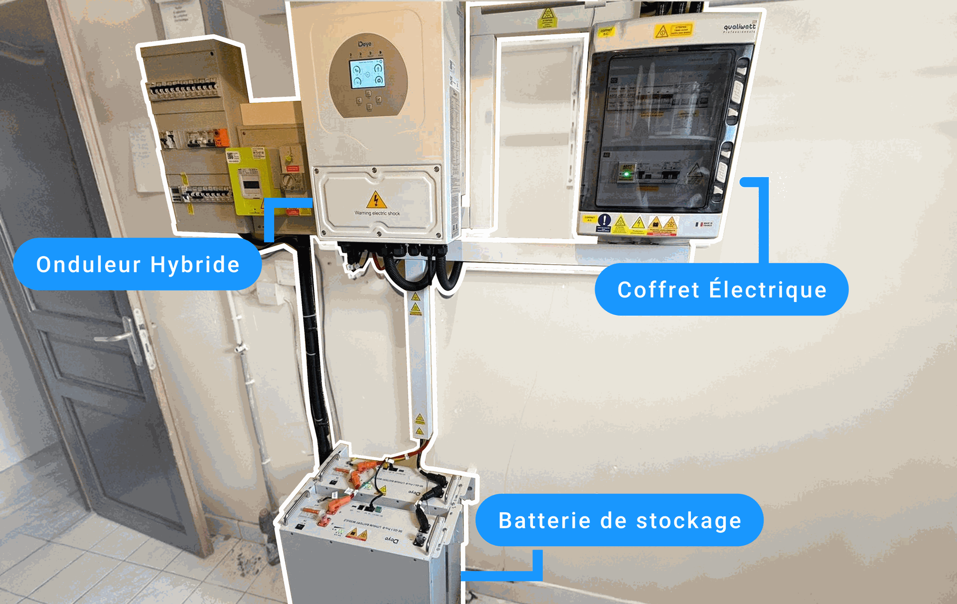 Nous requérons un espace de 330×580×232 mm pour l'installation de l'onduleur, ainsi qu'un emplacement dédié pour le coffret électrique, dont les dimensions sont de 330 x 430 x 180 mm. Concernant les batteries, nous n'avons aucune contrainte d'emplacement, celles-ci pouvant être disposées au sol, que ce soit en orientation verticale ou horizontale.